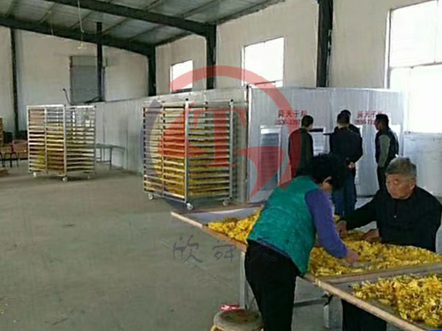 菊花烘干機,有溫控箱自動控溫,采用列管式三回程無煙熱風爐,由高溫高濕軸流風機將熱風直接吹向隧道內物料,濰坊舜天機電設備有限公司生產的菊花隧道式烘干機把待烘的新鮮菊花物料放在各層料車每層的托料盤上,再把物料從隧道的末端進入隧道進行烘干,待菊花烘干后,從隧道靠近熱風爐的一側出料,出一車干料,另一端進一車濕物料,做到循環間斷烘干。