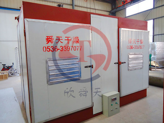 箱式烘干機,有內置熱源的,就放在裝有風機的風道內;外置熱源的,直接將熱風吹進裝有風機的風道內即可。