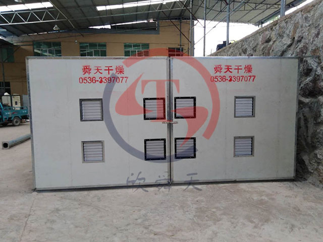 1、烘干機主體,就是一個長方體,一頭是熱風發生器(爐頭部分)和另部分烘干隧道組成,烘干隧道中間,有一面墻,也叫導風板;隧道一端是爐頭,另一端是進出料大門,因為是雙烘道,所以兩個門,每個門有兩個百葉風門(也可以是電動門),靠近中間的是內百葉風門,靠近兩側的是外百葉風門,四個風門,有兩個在工作,分別起到排濕和進新風的作用;爐頭這邊,長方體頭端中部,是一個內百葉風門(可調),熱風發生器和風機之間兩側,是外百葉風門,分別起到進新風,排濕的功能;熱風發生器,兩邊烘道由風機共享。